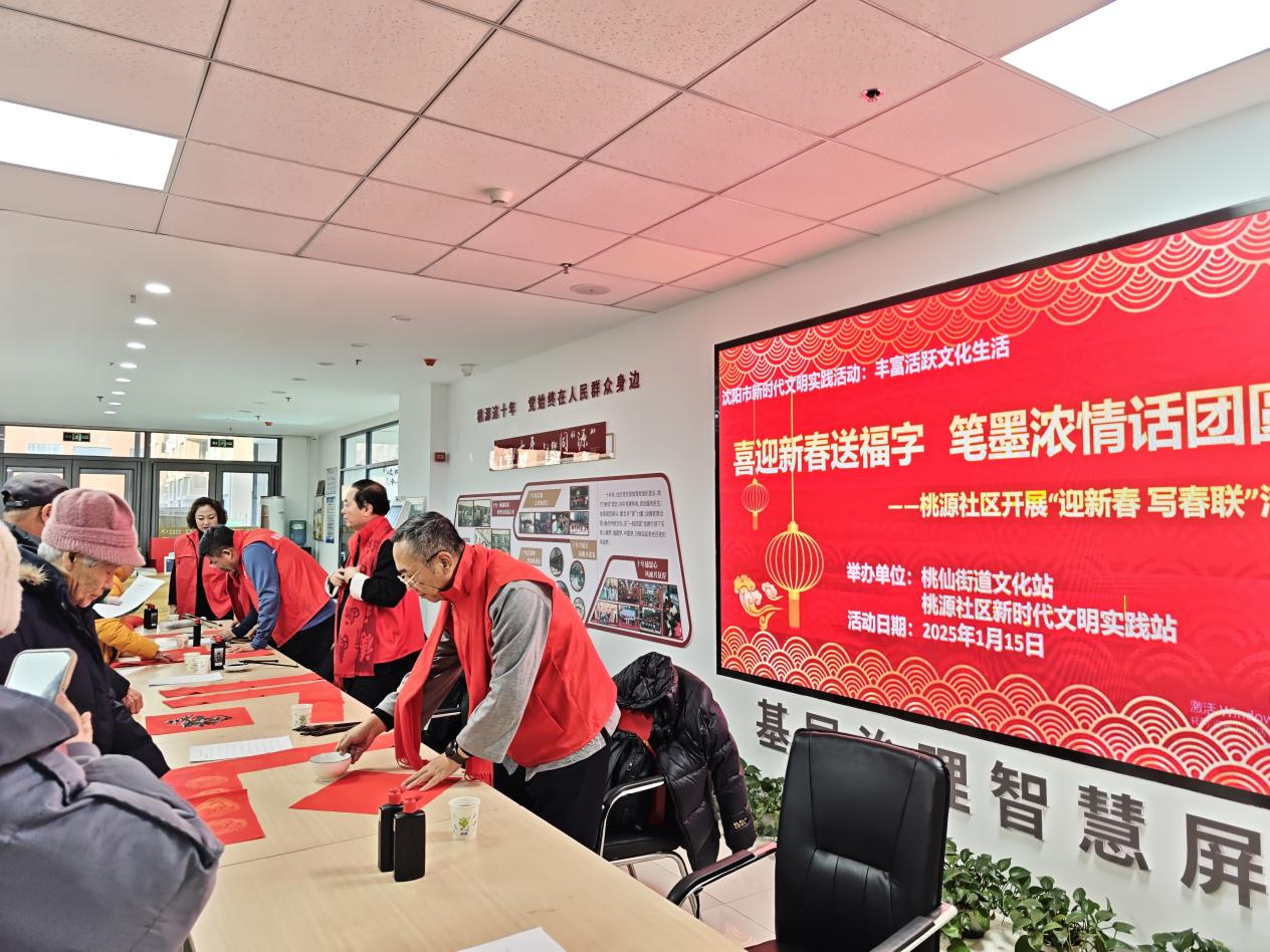 1月15日上午,桃源社区在一楼活动室隆重举办了以“喜迎新春送福字,笔墨浓情话团圆”为主题的迎新春写春联活动。此次活动旨在丰富社区居民的文化生活,让居民们体会传统文化的独特魅力,共同营造喜庆祥和的节日氛围。