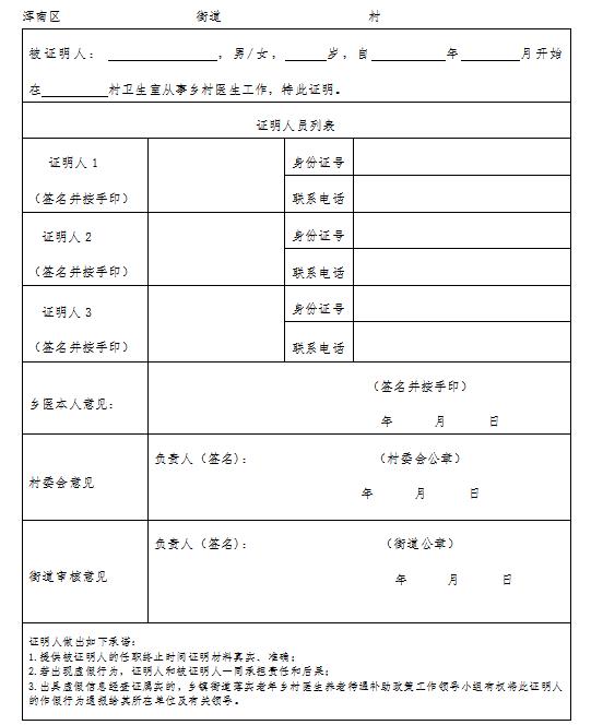 2.工作年限以乡村医生在村卫生室实际工作时间确定,剩余不满一年的按一年计算。起始时间原则上以提供证件时间为准,申请人也可提供医疗收费票据等相关物证证据证明其起始工作经历和起始年限,或辖区3名以上村民、村委会及街道共同出具起始时间证明。(见附件6、7)