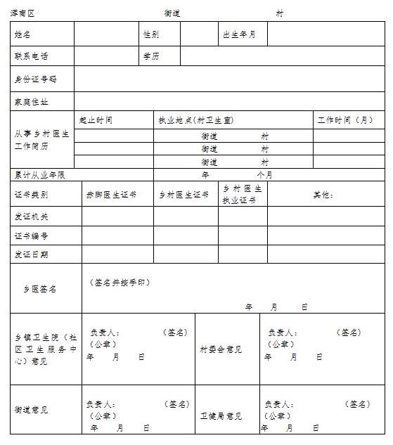 3.初审。申请人携带填写完整的一式二份登记表和相关证明材料到原从事乡村医生所在街道集中初审。