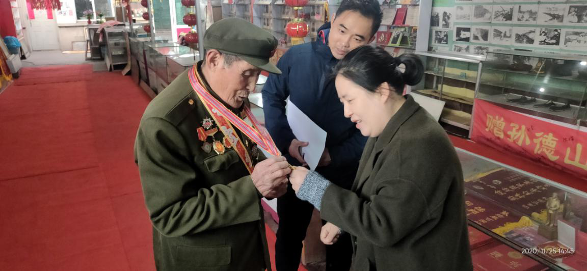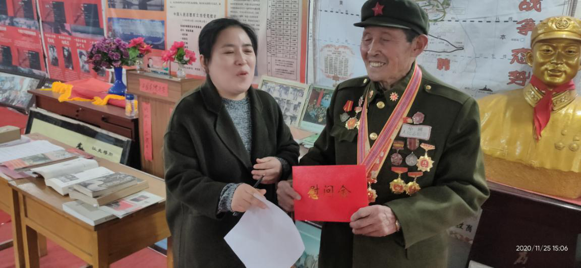 11月25日星期三,沈阳市退役军人事务局优抚处副处长金银华同工作人员李君,来到高坎街道退役军人服务站,看望慰问抗美援朝老战士孙德山,从旧站村路口向东一路过来,远远看见在鲜艳彩旗飘动下的一位年俞九旬旧站社区居民退伍老兵孙德山,得到通知沈阳市退役军人事务局,领导来看望自己早早的在路口迎接,当接过金银华副处长两千元慰问金时,老战士孙德山眼睛红润了,嘴里一直在说谢谢党、谢谢组织对我的关怀。孙德山1949年参军入伍,参加过抗美援朝战役,为了怀念为国牺牲的战友,自己省吃俭用,克服万难,用8年时间,自己靠捡破烂,硬是建起一座200平米的“抗美援朝纪念馆”。几十年来,他默默无闻,安心农业生产,从没有向组织开口要过任何待遇,是新时代的另一个“张福清”。89岁高龄的孙德山老人,作为一名普通老兵,没有豪言壮语,没有惊天动地,有的只是满腔热情,无时无刻为国家分忧,为身边群众着想,胸怀大爱,以实际行动彰显了新时代一个老兵的家国情怀。